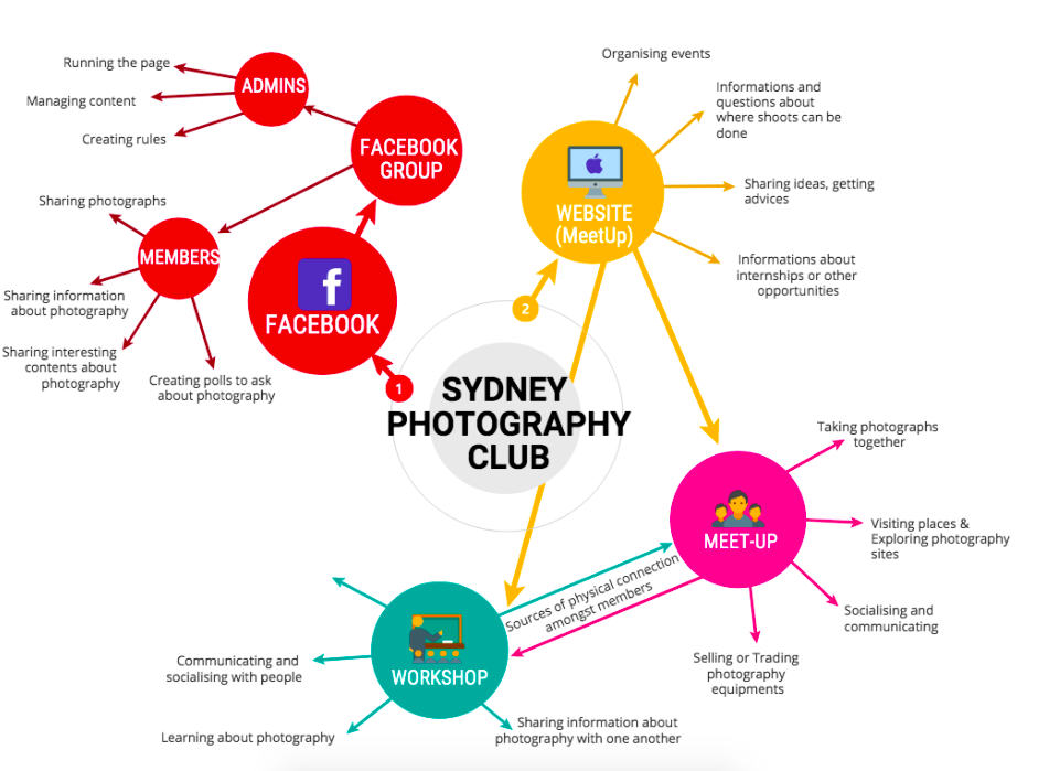 the group uses many forms of communication in and outside of the Facebook page. Interpersonal communication is evident in the group through members supporting each other, through giving advice and assistance, opinions and appraisal. This displays that members are exchanging messages and meaning through commenting on someone’s post. Thus, the posts allow discussion and debate in the comments as people many have differing views or asks questions about what is posted, allowing two-way communication to form. Additionally, presentational communication is not so evident in the group as everyone has the ability to comment, ask questions and voice their opinions on posts. The only example of presentational communication in this club is on the ‘MeetUp’ page, where information is presented about an event, making it a one-way exchange of messages intended to not start a discussion. Another example of this mode of communication on the external page is through advertising, which is also aimed to inform people and get them to act on their own account. However, despite the intended one-way communication in these posts, there is also interpersonal communicating as people are asking questions and others are answering. Therefore, the ‘Sydney Photography Club’ is mainly an interactive community which encourages member to interact with each other and create meaning.