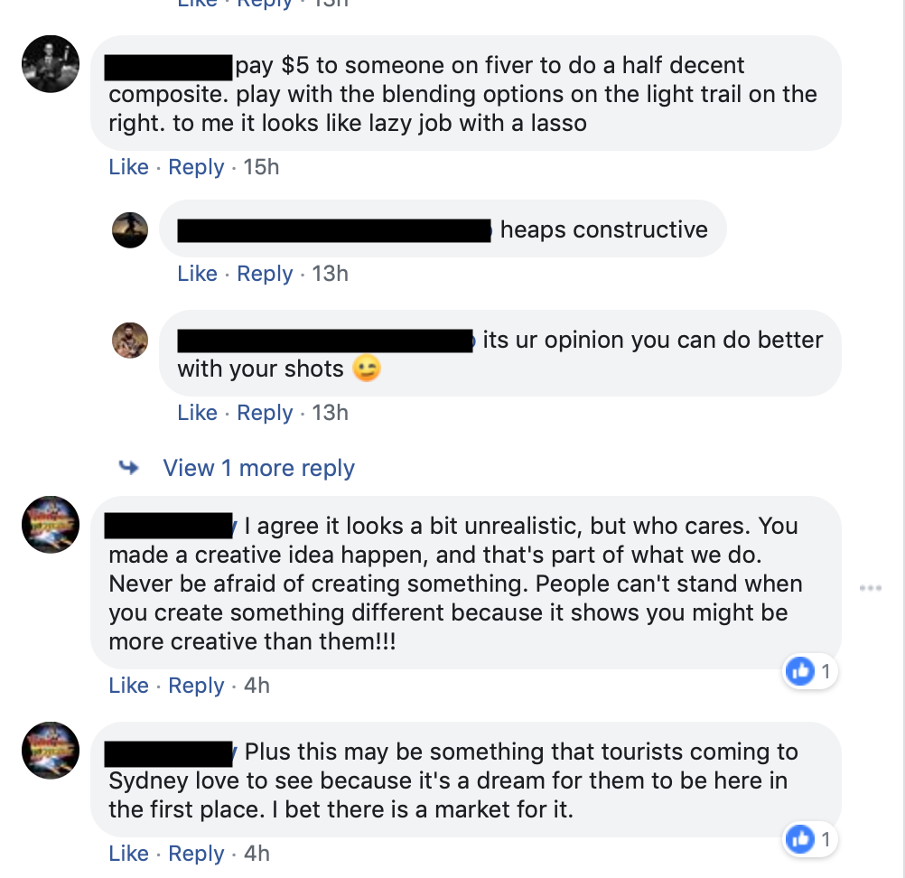 Although members of the group do not interact face-to-face, unless at events or workshops, the page is flooded with comments, feedback and reactions to one another’s posts. People interact in a way that many communities don’t, as they seem like a close family of 13 plus thousand people. Just through looking at the comments on photos, one can see many forms of interaction, one being question and answer, where members are able to pose questions to the group through polls or posts, such as what’s the best name for their photo or the best place to shoot, composed of broadly based relationships in which each community member felt securely able to obtain a wide variety of help” (Wellman, 1988,p 97)(see photo 1). This then gives other members the opportunity to help by sharing their knowledge of photography as well as offering ways to help improve others work, such as suggesting a software or camera to enhance an individual’s photography. Baym explains this by describing that “When people provide and receive social support in online groups, they are contributing to one another’s accumulated social capital” (Baym, 2010, p.82)(see photo 2). Not only can members get feedback on their work, they also get words of appraisal from others, encouraging them to continue doing what they love. This shows that the group interacts in an encouraging and supportive manner, making it a beneficial club and community to be a part of.
