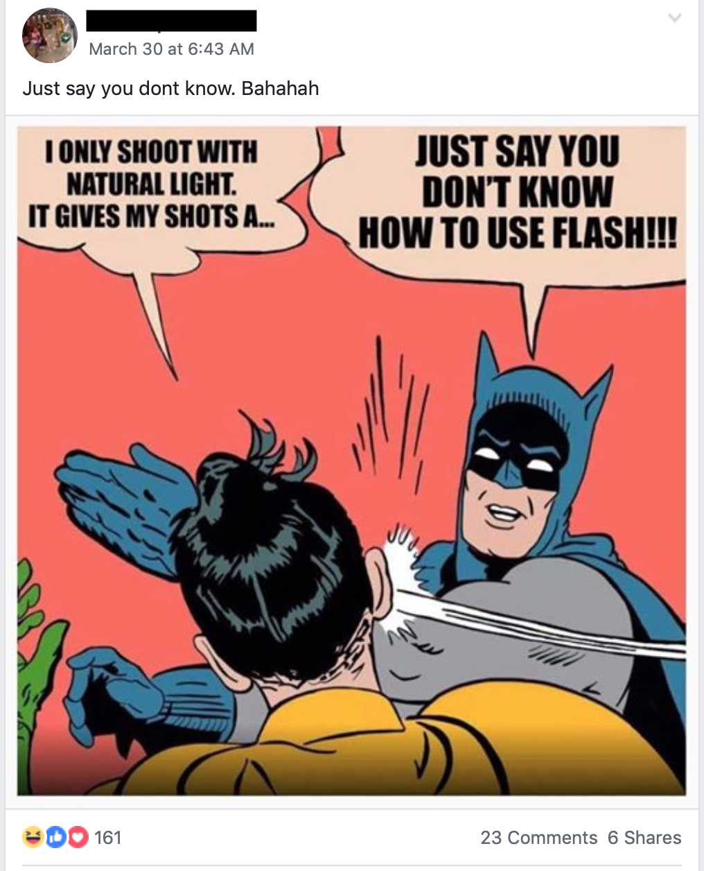 As Baym states “speech communities have distinctive patterns of language use which enact and recreate a cultural ideology that underpins them” (Baym, 2010, p.77). This is seen in the group as there are many shared practices regarding how people post their photography and the language they use that differs to other groups one would find on Facebook and other media platforms. The language used is what someone would classify as photography jargon, such as the use of the words “moment” to describe a photo, “capture”, and incorporating names of camera equipment, angles and lenses into their normal vocabulary. The group also posts memes and funny posts that only photographers would understand and find amusing (see photo 3), highlighting that their shared interest allows them to communicate in ways they are unable to in the real world.